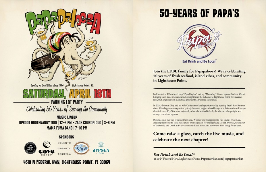 Join us for Papapalooza as we celebrate 50 years of Papa’s with a full day of fresh seafood, live music, and community vibes! Enjoy a parking lot party filled with great food, drinks, and island energy.